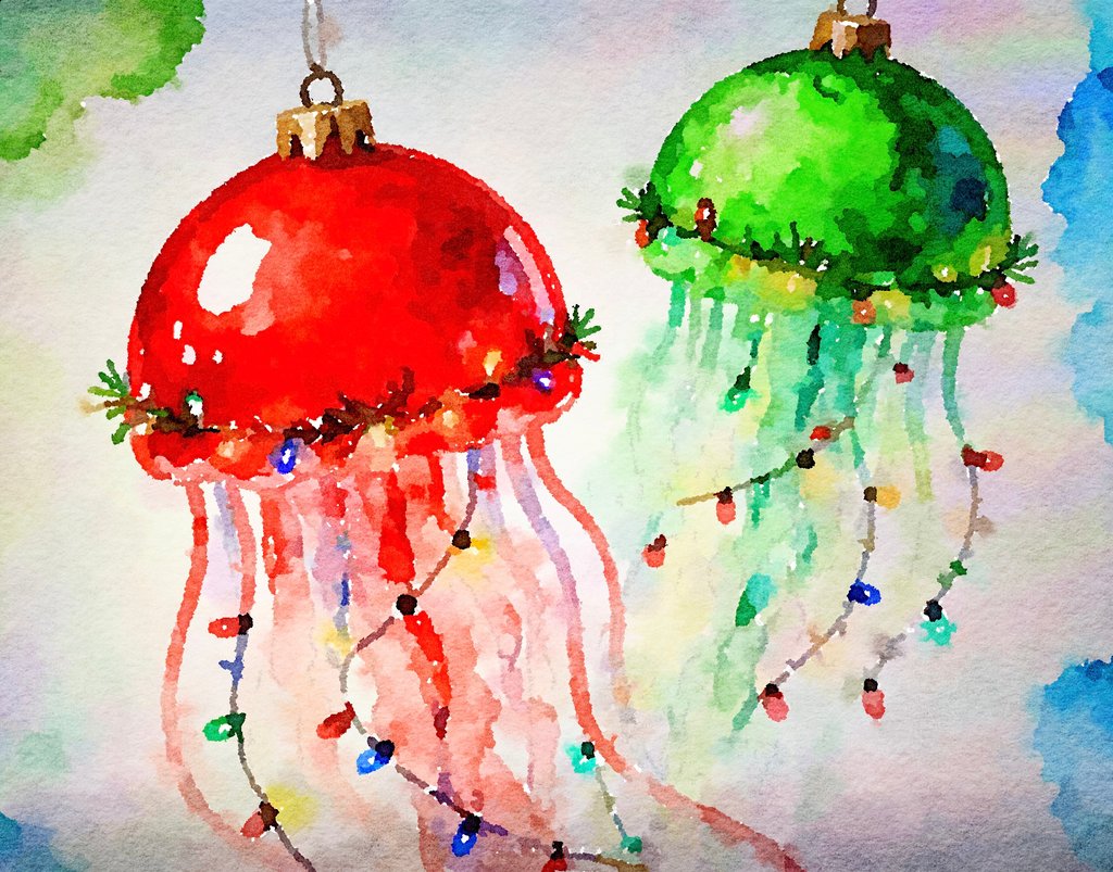 This whimsical watercolor painting reimagines Christmas ornaments as part jellyfish, part holiday lights, creating a playful and festive fusion of sea and season.