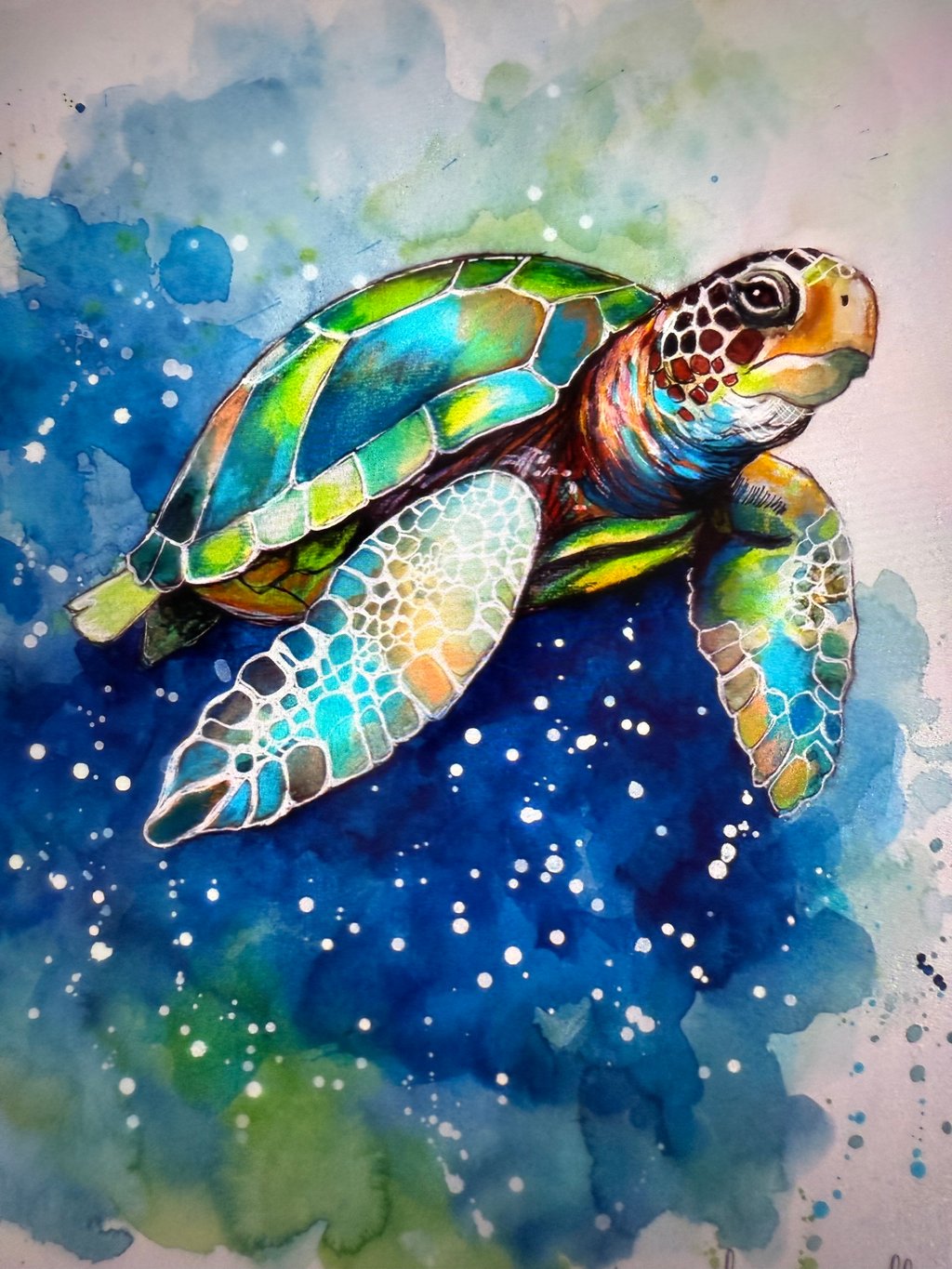 A sea turtle swims gracefully through the clear blue water. Bubbles trail behind as the turtle swims.