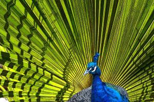 This peacock was at a friend's nursery and the palm fan is one from Hawaii. It was simply fun to put them together.