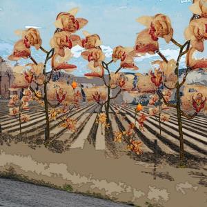 This is a fantasy piece inspired by the orchids that grew for many years in our garden while we were in Oakland, CA, and from a drive down Interstate 5 on our way to L.A. This field was prepared for planting and we snapped a pic. Funny how these orchids just wanted to bloom here....