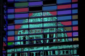 We are often entertained and delighted with what we find reflected in the world around us, and most any city will provide an ample supply of material. Here we see a reflection from Washington DC.