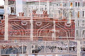 This is an example of the fine reuse of older materials from the tobacco days of Durham as it reinvented itself after Big Tobacco left. These metal rails are left over from tobacco warehouses, and we've 'painted' them as an overlay to the warehouses themselves.