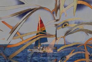This image combines a favorite pastime in HI--sailing along Waikiki, with yet another form of leisure. Do you recognize it? Are birds flying by?? Nope! Superimposed in front is a classic aloha shirt. You can even make out one of the buttons. Enjoy!!