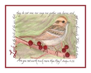 "Finch in Winter" is inscribed with the Bible verse Matthew 6:26 in hand-drawn calligraphy -- "Look at the birds of the air, that they do not sow, nor reap nor gather into barns, and yet your heavenly Father feeds them. Are you not worth much more than they?" (NASB). Media: Watercolor. This artwork serves as an ever-present reminder of our great Provider -- Jehovah Jireh! All profits go to support the ministry "Faith Comes by Hearing". Please visit WingAbouts.com for more information.