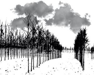 A look at the local tree farm last winter just after a light snow. We assume the trees will all look lively in the Spring. Slightly enhance with Photoshop to bring out more of a dynamic and abstract image.