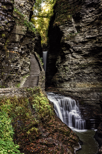 Staircase along cascading waterfalls inside Watkins Glen State Park in New York