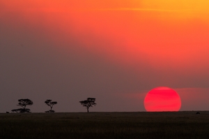 The combination of dust and fire make for incredible sunsets and it's hard to find another place on earth where there is more dust and fire than Africa. The villagers burn the fields to encourage new growth for their cattle and goats. At the same time, there is burning to encourage the migration movement. The vast African plains and the few trees make an impressive stage for the sun to drop behind.