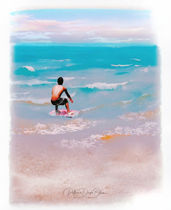 A multi exposure layered photograph image of a summer day at the beach of a skim boarder finished in an oil painting effect.