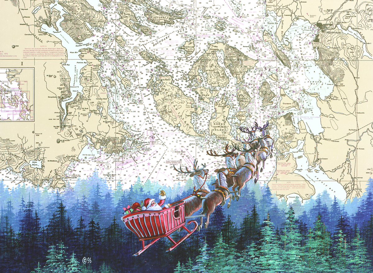 Santa Claus waves “Merry Christmas to all and to all a goodnight!” as he flies his sleigh and 8 tiny reindeer high over a forest of evergreen trees. The sky backdrop is a nautical chart of the San Juan Islands just north of the Puget Sound in Washington state.