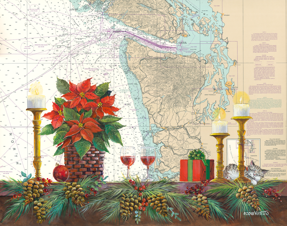 This festive still life painting captures the joy of the holiday season. Front and center are decorative items that bring beauty and peace this time of year - garland, candles and vibrant, red poinsettias. The wrapped gift and wine glasses represent generosity and gathering with family and friends. And the snoozing cat tucked behind the candle gives a cozy feeling and reminds us to rest and soak in the season. Finally, behind this mantle display is nautical chart 18003, which includes the Pacific Ocean, Western Washington and Puget Sound area.