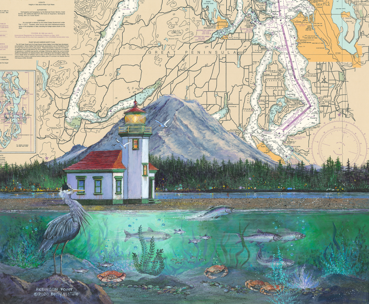 Original painted in 2020, this captivating artwork celebrates the natural splendor of the Pacific Northwest. At its heart stands the Robinson Point Lighthouse, surrounded by a lush evergreen forest and framed by the majestic Mount Rainier. Beneath the surface, a vibrant underwater seascape teems with marine life, adding depth and movement to the scene. The entire composition is set against a nautical chart of Puget Sound, featuring Vashon Island and its connecting neighbor Maury Island, where the lighthouse is located on its eastern side.