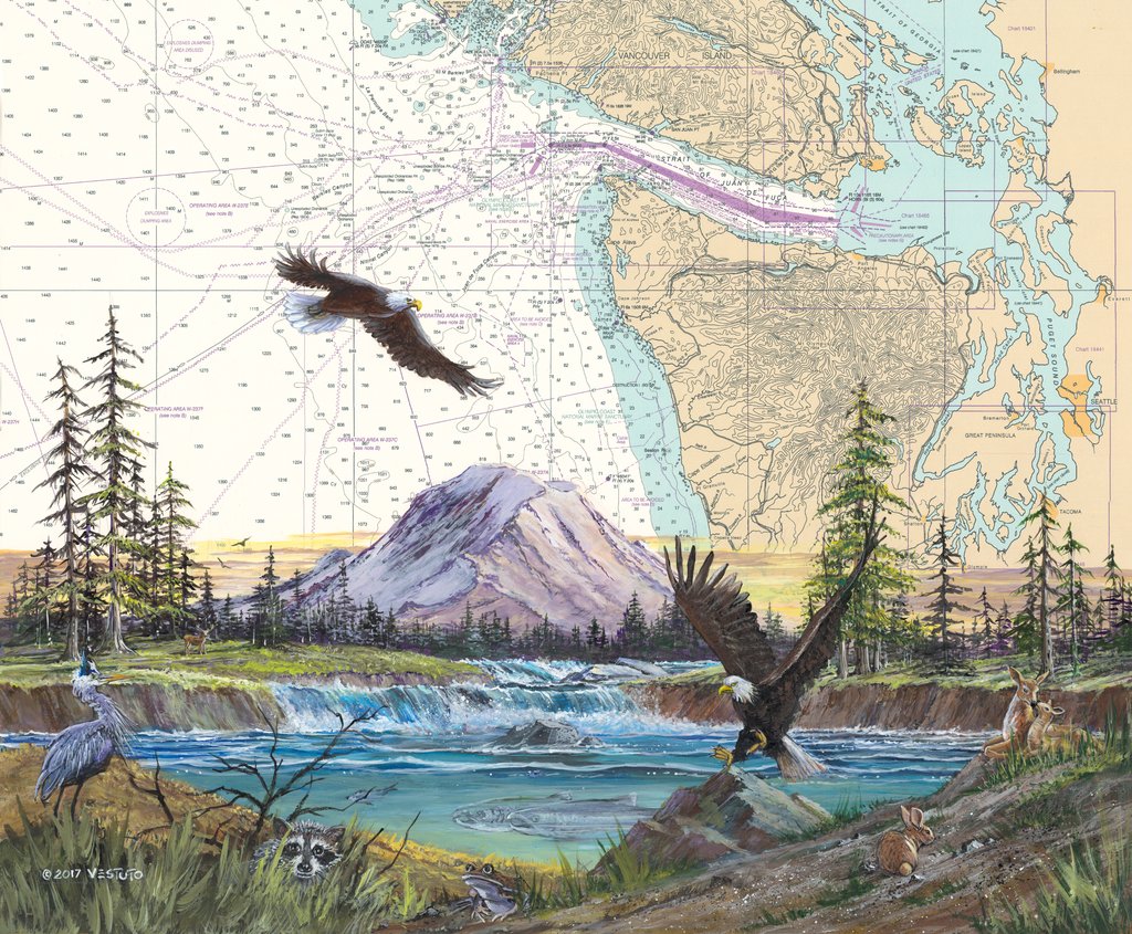 The Forest - Mt. Rainier with forest and woodland creatures on a nautical chart of Western Washington.