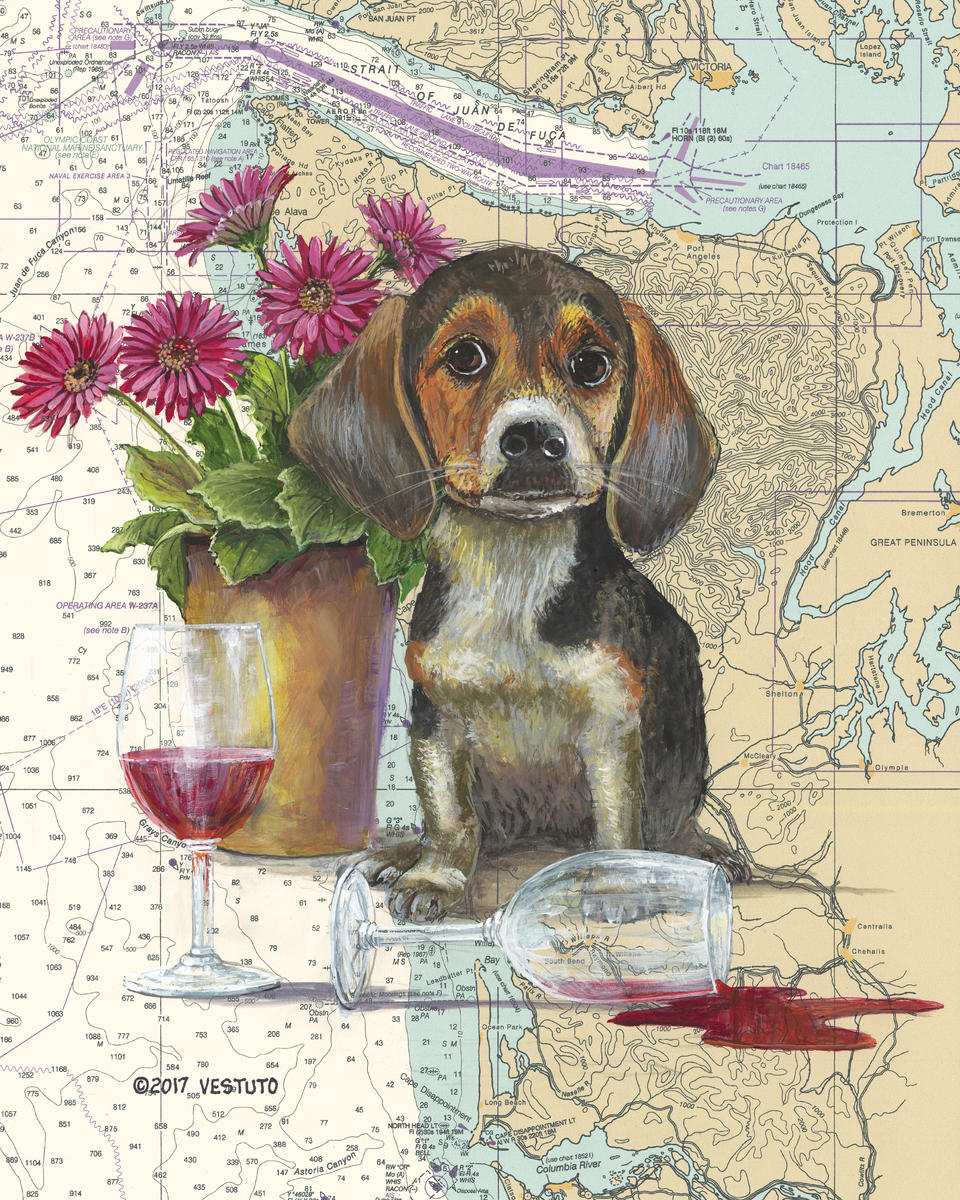 Painted in 1997, this still life piece captures an adorable, yet mischievous beagle puppy caught in the act of toppling a wine glass. Perfect for a dog lover and sure to make you smile. The backdrop is a nautical chart of Western Washington and the Puget Sound area.