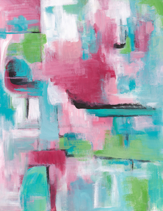 Abstract acrylic in shades of magenta, teal, green and black. Bright and cheery, showing hints of spring and carnivals.