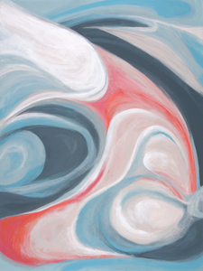 Connections are fluid, changing, vibrant, and living things. The connections between us are like conversations. Large-scale painting in muted tones. Flowing organic shapes that appear to melt into each other. Shell pinks, cadet blue, sky blue, coral, touches of orange, white, and gray. Painted in Golden fluid acrylics.