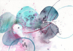 Reminiscent in a strange sort of way of the Trapper Keepers I used in the 80s - this abstract updates that visual and offers a fresh outlook. Shades of turquoise, aqua, blue, purple, pink, black, white. Watercolor on paper.