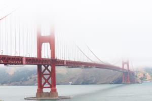 A beautiful depiction of the iconic Golden Gate San Francisco Bridge during a foggy day.