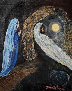 She approaches the familiar cave with a single rose, seeming to float at the entrance to the sacred space. Emanating from the recesses of the heart-shaped cavern is a light that draws her heart ever closer in spirit and in truth. The lion and the buffalo are there and the whole creation pulses with the life that was in him, now poured out into all the world. A flow of rainbow-colored water gushes forth from where someone has left a single candle in remembrance. A light shines in the darkness and the darkness has not overcome it. Below, life springs forth from an eternal pool that creates a heart-shaped indentation in the barren and shadowed landscape. She stands on the edge of all things, present to this passage, knowing there is no separation, no journey too long to make their Great Return. She will hold the single rose for all eternity. What is your essential story of life? What is alive in you?