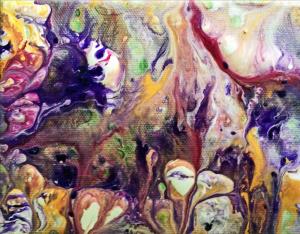 The stories sprang to life from my first-ever acrylic pour. Eyes were looking back or out and up. Figures floated through the sky, in the river, rising up from flame. Still she moved, making her way to purple and the flying turtle and all things beautiful alive in time. This acrylic painting is from the Spirited Life collection. Life is composed of many circles of creation and recreation. Spirited Life paintings are variations on the theme of life and dreams of a new world. Connect to your essential story of life as you explore paintings in the Spirited Life collection. What is your essential story of life? What is alive in you?