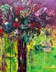 So much life can be found in a simple flower and an arrangement of flowers opens up a plethora of possibility in terms of connecting to life through the beauty of nature’s gifts. The bounty of the blessing is emphasized by the tall cylindrical vase in deep purple against the vibrant green background. The two colors in combination speak to my heart and soul of life’s richness in both the deeper, more profound and sometimes somber moments as well as the light, bright and happy laughter of the lime green with the form of a dancing angel in the background.
