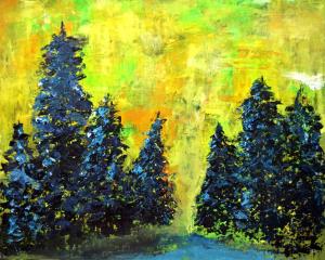 Trees seem to lean in at twilight around a pool of water. The sky above is alive with the color spring and the promise of a new day, though the trees are still thawing from a wintry snowfall. There is an air of excitement and anticipation and the subtle feeling of warmth that rises up from their evening conversation. This acrylic painting is from the Spirited Life collection. Life is composed of many circles of creation and recreation. Spirited Life paintings are variations on the theme of life and dreams of a new world. Connect to your essential story of life as you explore paintings in the Spirited Life collection. What is your essential story of life? What is alive in you?
