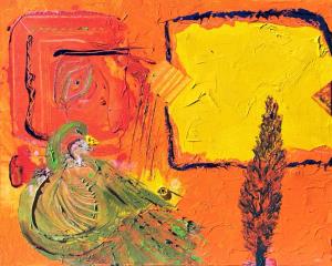 Against an orange field, feathered spirits move. All eyes are on the yellow sky in the window frame of possibility. A lone poplar stands in the foreground, on the verge of entering into the new day. Speak life. Walk by faith. See clearly that there is always an open field into which you may enter when you embrace a whole new way of seeing who you are and that you are, here and now.
