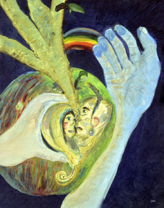 This, then, was the story of humanity, born of love yet divided, pitted one against the other. A hope for healing, face to face, heart to heart, rose up between them as they battled to believe. This Spirited Life painting by Virginia artist Dawn Richerson is from the Dreams for a New World collection.