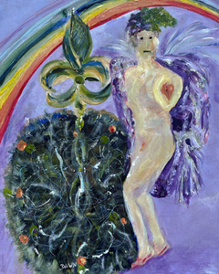 Through the haze, a figure, naked and exposed, carries a heart through time. He has wings but has forgotten his innate ability to remember now an ancient story and step into the portal of truth, where all his dreams might come true again. A Dreams for a New World series Spirited Life painting. What is your essential story of life? What is alive in you?