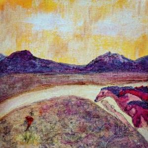 This painting is an interpretation of a desert scene outside of Taos, New Mexico, just after sunset on a rainy evening (June 23, 2016, during "monsoon season"). The slope of the dirt roads curved like an arching angel and the wind seemed to conjure three wild horses ready to run wild and free and awaiting the invitation to the open land beside the Rio Grande River Gorge. With respect and honor for the call of Spirit, they await the invitation to surge into the open land. This was the vision I saw that night. This acrylic painting is from the Spirited Life collection. Life is composed of many circles of creation and recreation. Spirited Life paintings are variations on the theme of life and dreams of a new world. Connect to your essential story of life as you explore paintings in the Spirited Life Collection. What is your essential story of life? What is alive in you?