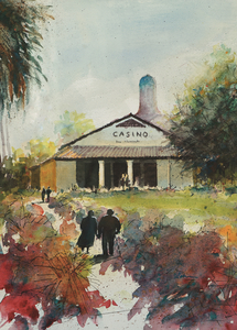 This is a watercolor of the landmark old Casino in San Clemente, whose heyday was in the Big Band era. I have placed an elderly couple in the foreground. He leans on a cane, she holds his hand. Maybe they danced here, maybe they were married here. The title "All In" recalls not only the dealer's call when someone bets all their chips on a hand but also the longtime devotion of this couple to one another.