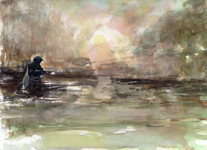 This watercolor is a product of my forays to Rangeley, Maine with my brother (who has a camp there) and his friends. I called this painting Rosy-Fingered Dawn because, as a former Classics student and U.S. ambassador to Greece, the early morning colors brought to mind the stock epithet (ῥοδοδάκτυλος Ἠώς /rhododáktulos Ēṓs/rosy-fingered Dawn) that Homer used in both the Iliad and the Odyssey. My fishing companions are all far and away more accomplished anglers than I, but they are also good-humored and patient, so I get to enjoy the zen of standing in the river and casting, however ineptly. Very occasionally, I actually do catch (and release) a fish. I wish I had had the sense to take up fly fishing earlier, like my brothers. But I’m trying to make up for lost time with a few drawings, sketches and watercolor paintings that record my impressions.