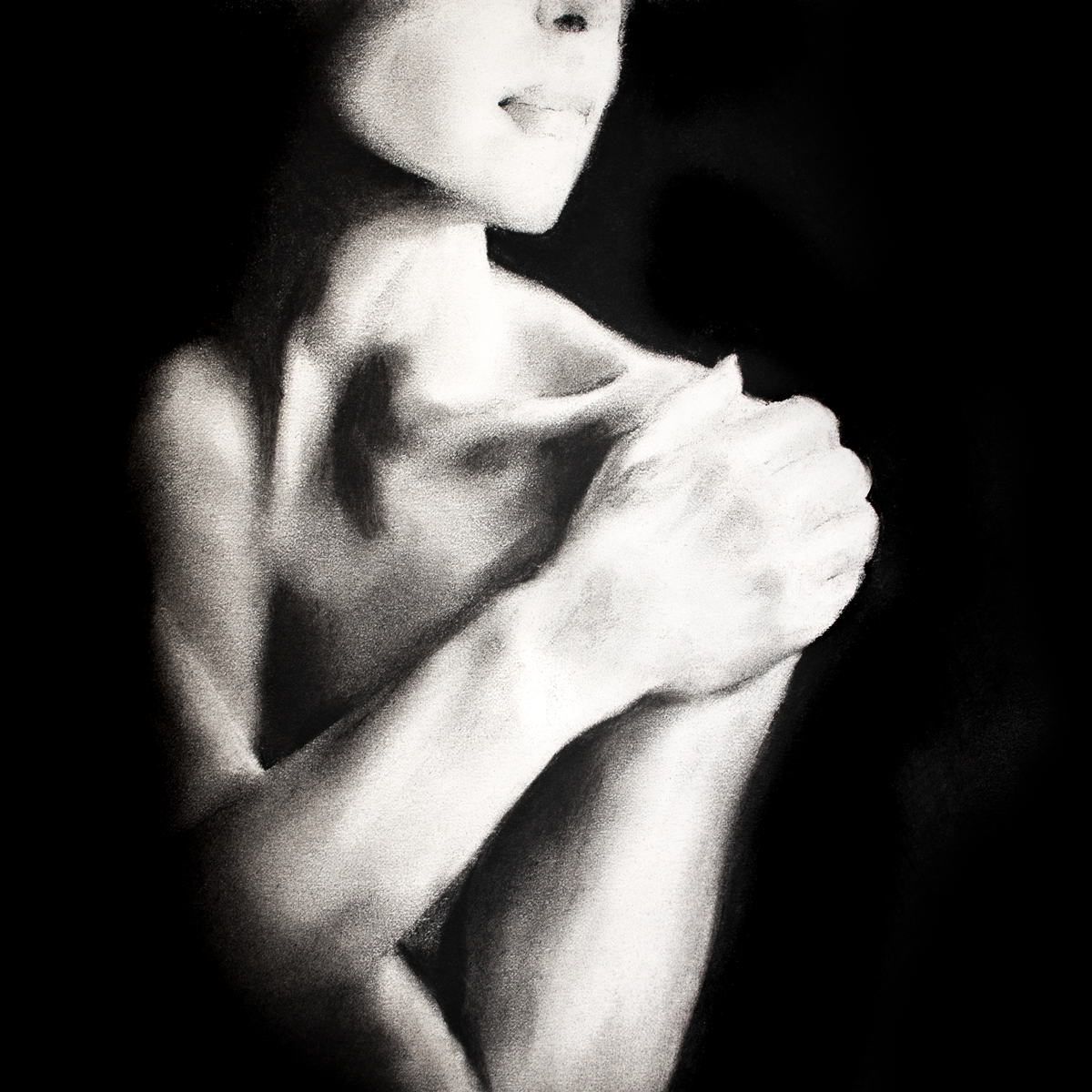 A fine art print of a the soft morning light on a woman's shoulder drawn in charcoal. (2021_1910)