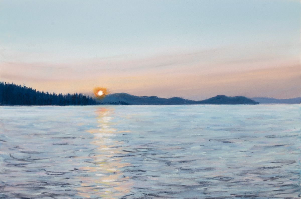 Fine art print of a small soft pastel. This painting depicts the soft colors of a summer sunset across lake Winnipesaukee, Alton Bay, NH