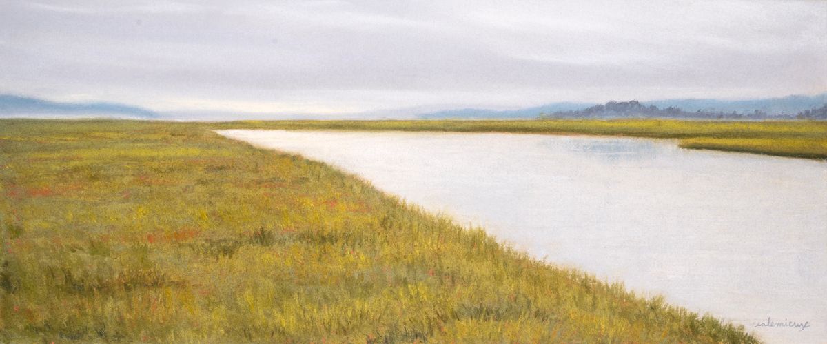 Fine art print of a soft pastel painting. Soft marsh grass along an estuary in Scituate, MA.