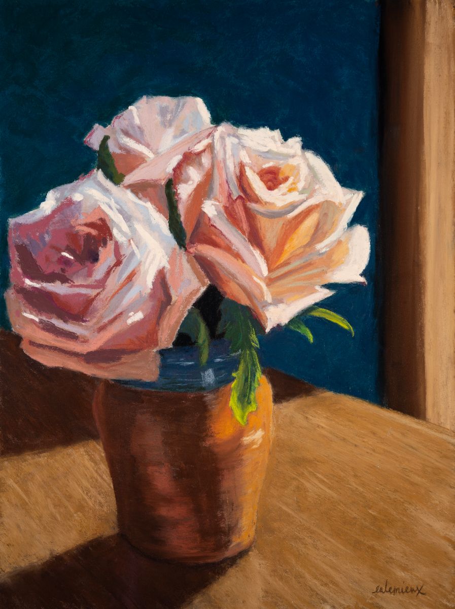 Fine art print of a soft pastel painting. Luminous light on soft rose petals.