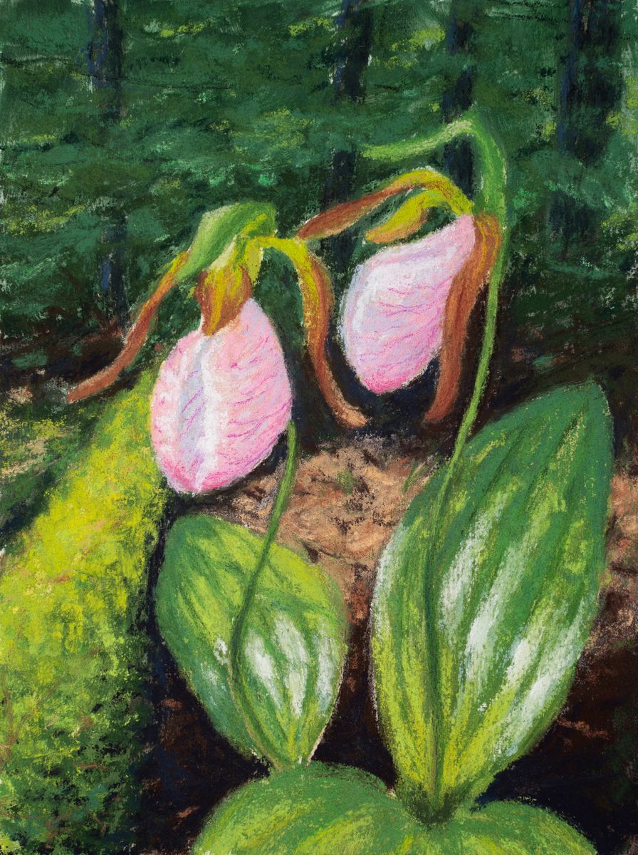 Fine art print of a soft pastel painting. Lady slippers in woodland shade.