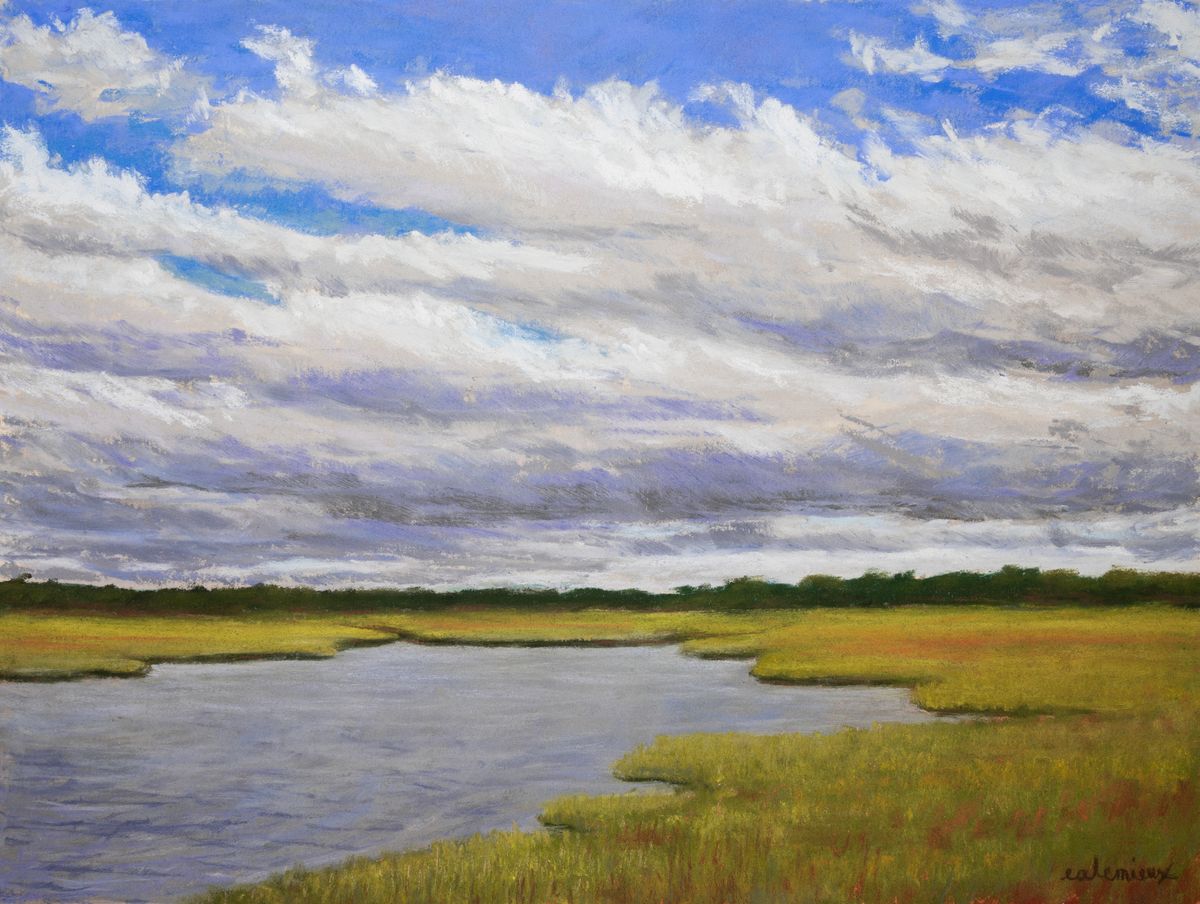 Fine Art Print of a soft pastel painting. Dynamic clouds over a marsh on a bright day.