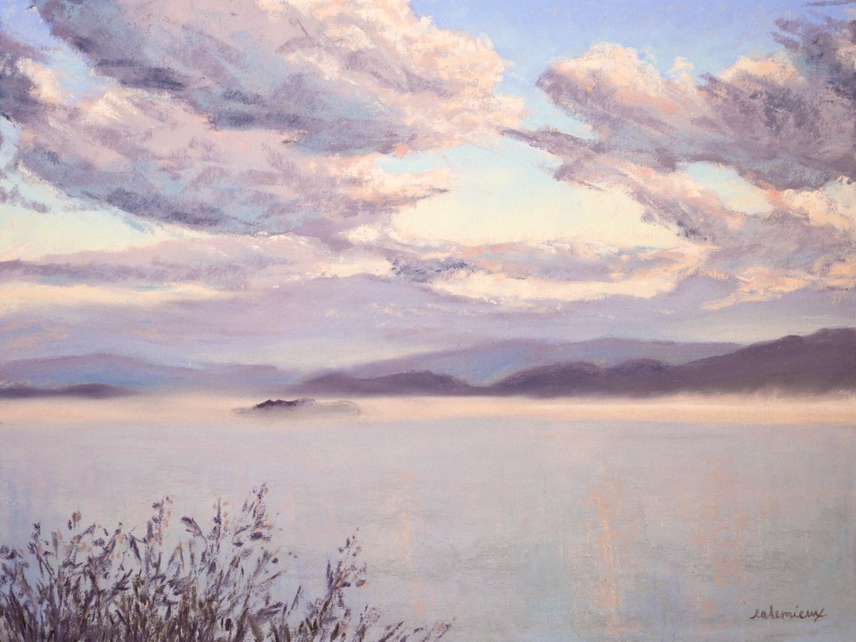 Fine art print of a soft pastel painting. Morning mist over Lake Champlain, Burlington, VT.