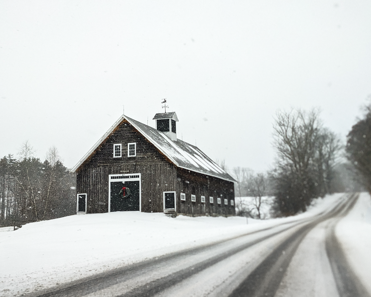 An early winter drive provided this snowy view of a beautiful barn on the way to Francistown, NH. Fine art photograph. (2024_0107)