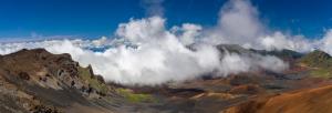 A four-frame, single row panorama of the caldera taken at the Haleakalā volcano summit on Maui, Hawaii, using with a Nikon D850 with a 24-70mm Nikkor lens at 50mm. We skipped the sunrise crowds to hike in solitude and enjoy the mid-day colors as clouds cast shadows on the volcanic landscape.