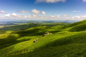 View from the Roc de Cuzeau, Chambon-sur-Lac, France, looking east toward the Rhone Valley and the Alps. The Roc, at 1737m, forms the east wall of the caldera of an extinct volcano in the Puy de Sancy range in the Massif Central. It is easily reached by a gentle climb through sheep pasture from the Col de la Croix Saint Robert. There was a stiff breeze that day (perhaps most days), and the clouds were casting fast-moving shadows across the valley. I waited for the sun to briefly highlight the rock outcropping in the center of the frame.