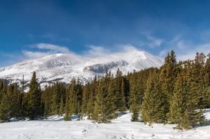 View from the trailhead at Hoosier Pass summit of snow blowing from the peaks of Mt. Democrat and Mt. Lincoln after a big winter storm. Summit County, Colorado.