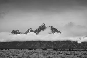 Black and white composition of the Teton mountain range with layer of clouds after a late summer storm left a dusting of snow on the peaks. Moose, Wyoming.