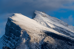 Mt. Rundle (2949 m) after a early winter storm, with newly fallen snow blowing from the peaks. Banff, Alberta, Canada.