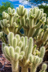 Cholla cactus illuminated with late afternoon light. Desert Botanical Garden, Phoenix, Arizona