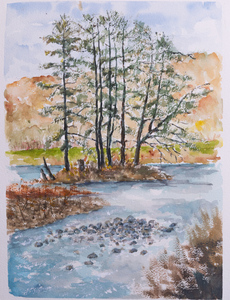 2011 RINGWOOD MANOR, NJ. Situated on an island in Sally's Pond in Ringwood Manor State Park, N.J., I has painted these evergreen trees several times: twice from one side of the pond and another from the other side. In more than one instance, a goose climbed ashore and chased me away. I had inadvertently invaded her territory. Although the island was small, the half dozen trees found enough soil to plant themselves among the rocks and shrubs. I iis fascinated by the way they consumed the island. It was now their habitat. Whether sun, wind, or rain, they were there to stay. I wanted the painting to show the commanding presence of the trees on the island. Like these trees on the island, being in command is natural for some and sought by others. But, as some of the trees, battered, weathered and bent suggest, there is a price to pay for those who want to be a leader.