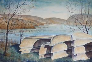 1990 ROCKLAND LAKE, NY. Every year, toward the end of autumn, the rowboats at Rockland Lake were hauled out of the water and piled, one on top of another for the winter months. It as a sure sign that summer and autumn were gone. I was intrigued by the design of the shadows on the boats stored on the shore of the lake. The rest of the picture was quite secondary. My primary purpose was just to paint the rich, deep, dark patterns of the shadows on the rowboats. As winter nears every year darkness comes earlier. The days become shorter. The earth turns away from the sun, and shadows grow longer and deeper. Shadows and darkness, however, have their own beauty. They bring new ways of seeing to us---as the shadows on the boats help us see the contours and shapes of boats in new and interesting ways. The shadows in our lives can likewise assist us in seeing other dimensions within ourselves that might otherwise be overlooked.