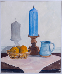 2003 Unable to go out on location and paint, I put together this combination of candle, fruit and cup. My first attempt was somewhat timid. So I repainted the still life in a more bold fashion, deepening the colors and letting the brush marks be part of the composition. An arrangement and assortment like this awakens one to the possibilities of the most common things around us. We needn't paint only the grandiose. The possibilities for art are all about us, even in the most ordinary of things.