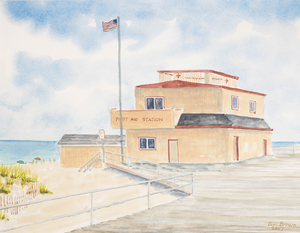 2007 OCEAN CITY, NJ At the northern end of the boardwalk in Ocean City is this rather uninspiring, functional building. Its sole purpose is to provide medical care for any who might need it. Sitting on a bench across the way on a busy, hot, Fourth of July weekend, I attempted to sketch and paint the building. The crowds of vacationers continually obscured my vision. Giving up, I came back on a day with fewer bathers on the boardwalk and completed my sketch. For someone or something to be helpful, like this rather mundane First Aid Station, it need not be inspiring or heroic. Assistance came come from the most unlikely and surprising sources.