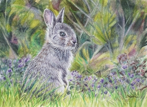 An adorable young bunny out exploring in the garden among the spring violets. From an original watercolor.